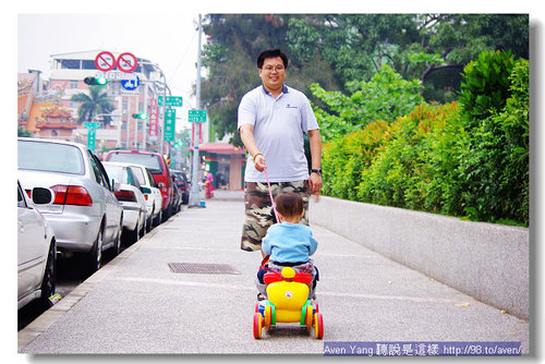 有一個不方便的地方就是車車輪子不會轉彎,還好我們有筆直的人行道可以走。